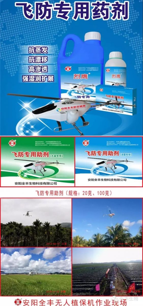 安陽全豐生物科技有限公司飛防專用藥劑及助劑助我國農(nóng)業(yè)現(xiàn)代化及廣大飛防組織早日實(shí)現(xiàn)施藥減量化。