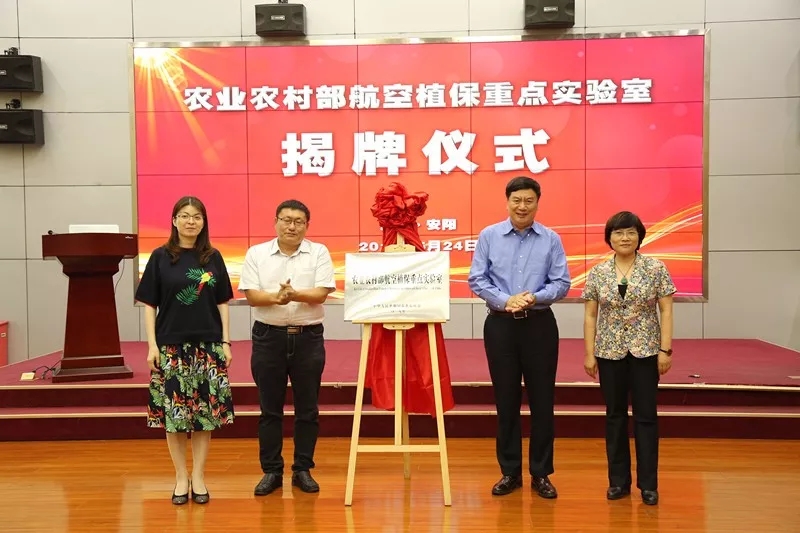 會議由華南農(nóng)業(yè)大學(xué)博士生導(dǎo)師蘭玉彬教授主持,實驗室主任王志國致辭。之后全豐公司王志國董事長、華南農(nóng)業(yè)大學(xué)蘭玉彬教授、農(nóng)業(yè)農(nóng)村部南京農(nóng)業(yè)機(jī)械化研究所薛新宇研究員和安陽工學(xué)院張玲副校長代表四家共建單位共同為農(nóng)業(yè)農(nóng)村部航空植保重點(diǎn)實驗室揭牌。