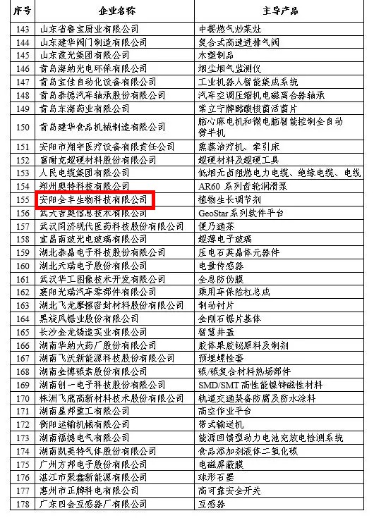 其中,河南有5家公司入選,分別是安陽全豐生物科技有限公司、富耐克超硬材料股份有限公司、人民電纜集團有限公司、鄭州奧特科技有限公司和安陽市翔宇醫(yī)療設(shè)備有限責(zé)任公司。